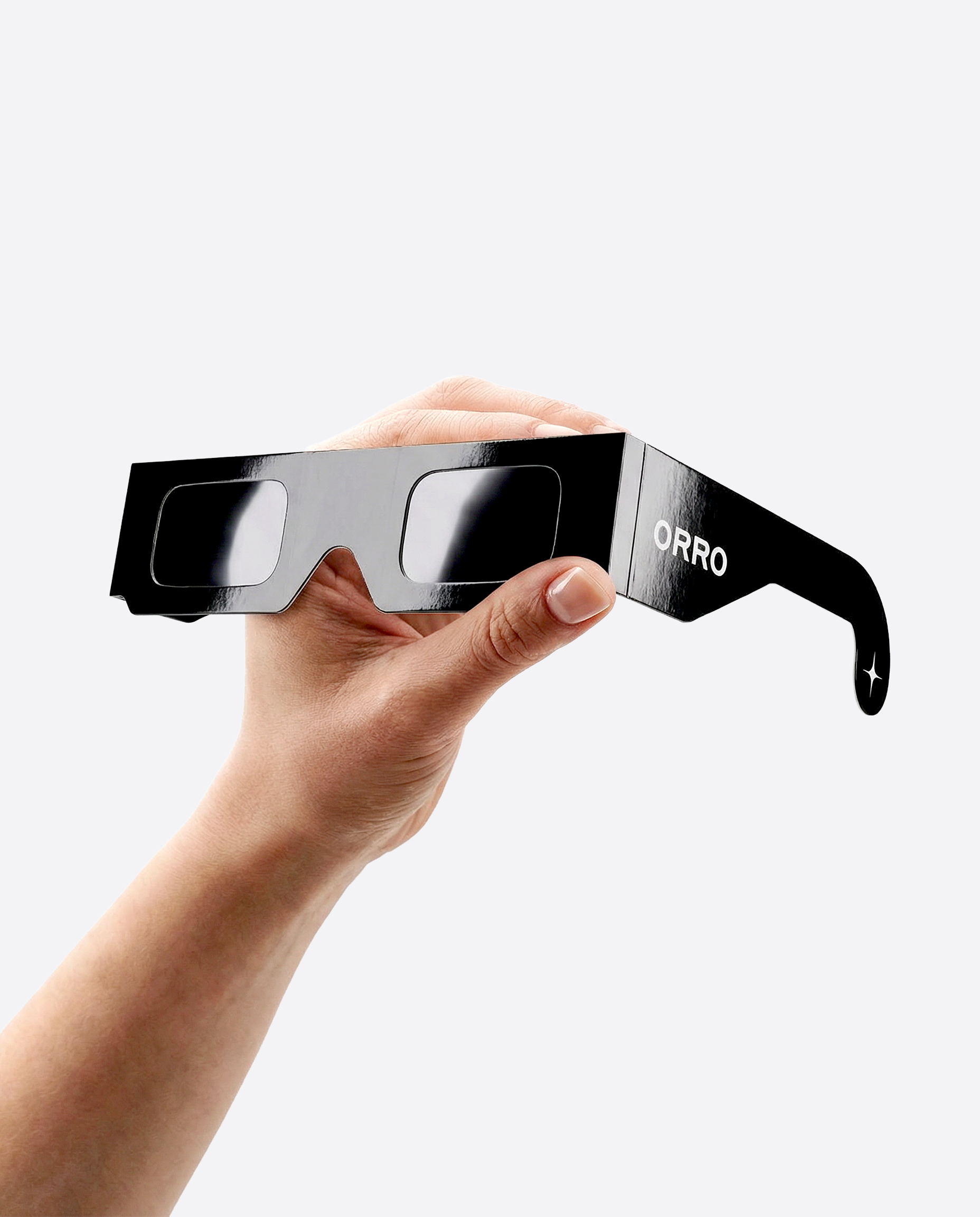 Thick polymer lenses eliminate visual warping leaving only a stunning, undisturbed view. Comfortable, lightweight paper frames sit discretely on the face, keeping you immersed in the moment. With an included protective pouch, store your glasses safely so they're as ready as you are for when the skies go dark. Whether this is your first eclipse or you’re a seasoned chaser, ORRO is your path to perfect alignment.